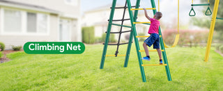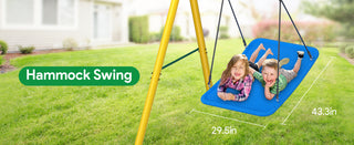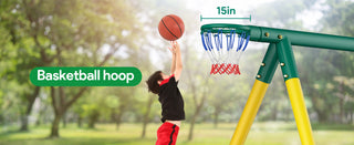 - 6-in-1 Outdoor Swing Set: Swings, trapeze, ladder, climbing net, and basketball fun, perfect for multiple kids, ages 3-12.