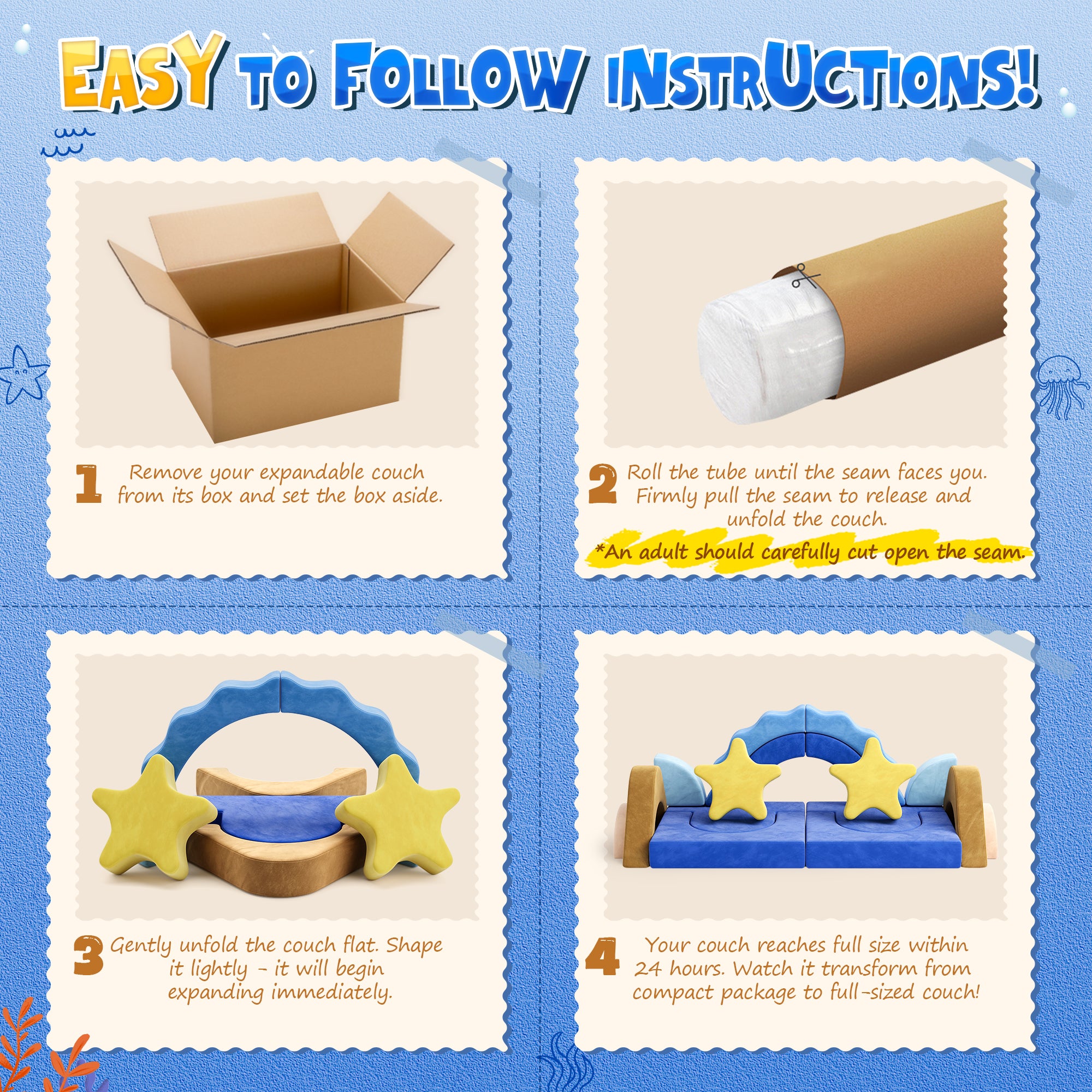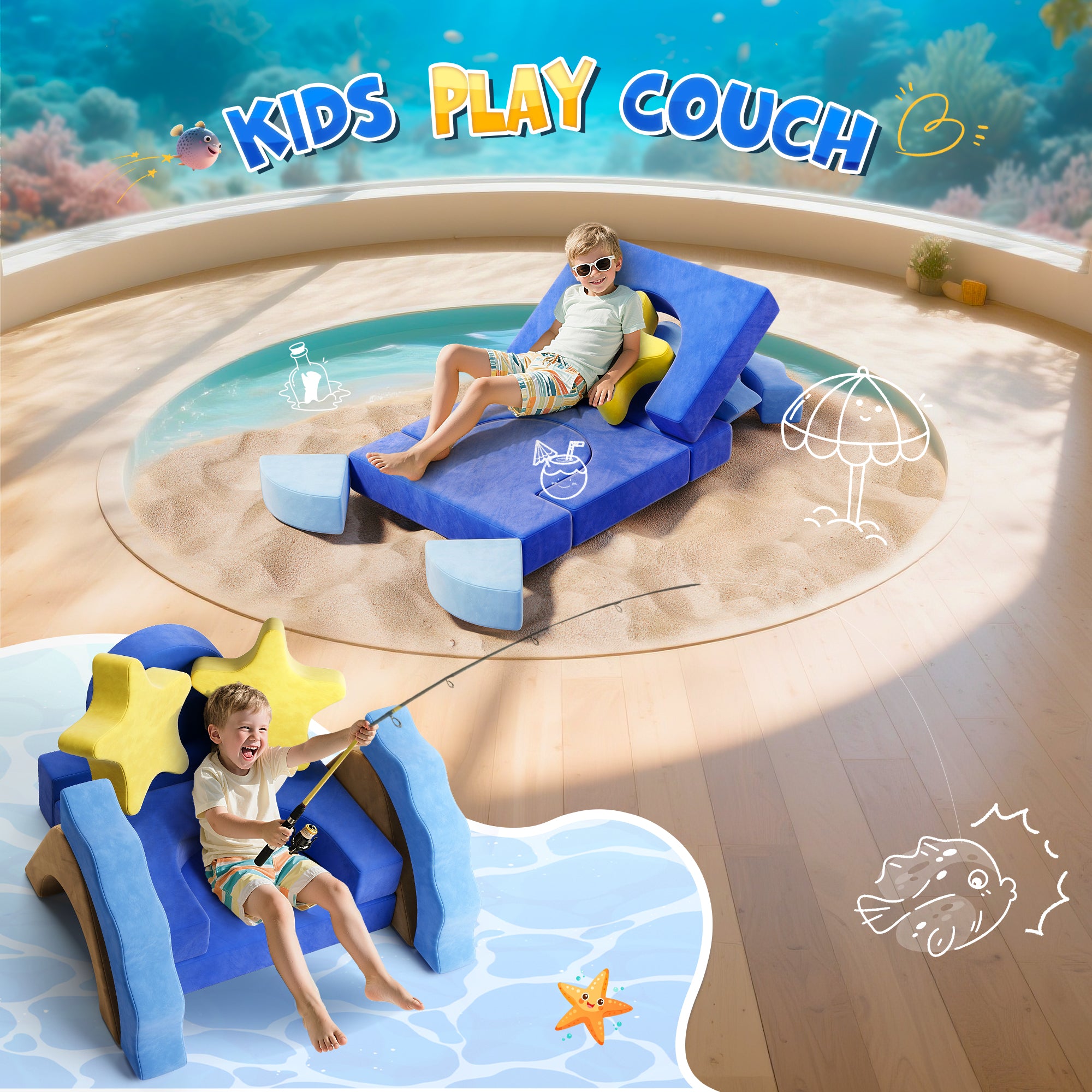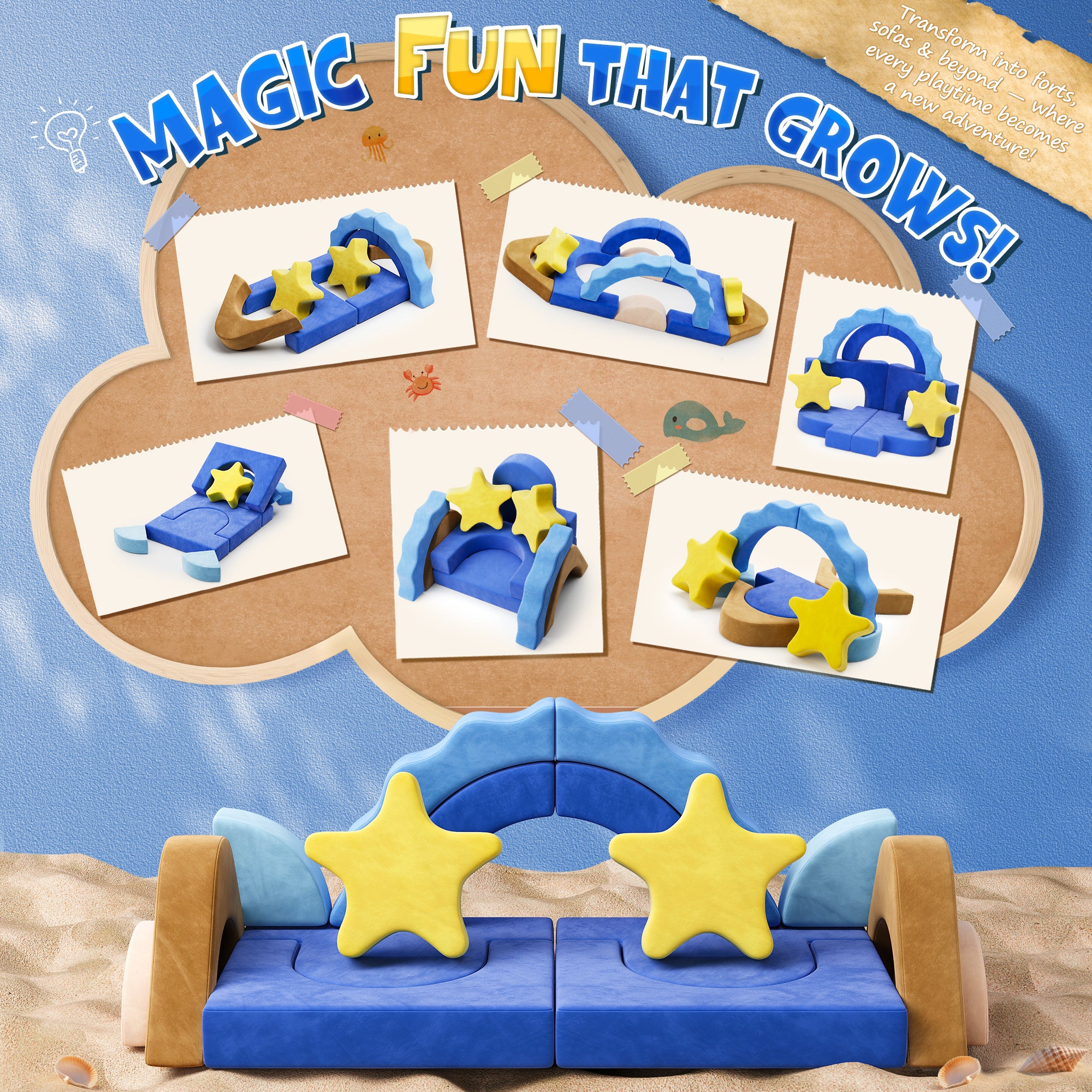 This EVMORE Sea World-themed kids furniture / kids and teen chairs /sofas & couches sparks imagination with vibrant colors and playful shapes. It easily transforms into a sofa, play mat, or bed—perfect for relaxing, climbing, or building forts. Made with high-density foam and soft, washable covers, it's safe, comfy, and easy to clean. Great for solo or group play, it encourages creativity, problem-solving, and social interaction. Ideal for birthdays or holidays, this multifunctional couch blends fun, learning, and comfort—making it a perfect gift for adventurous little ones.