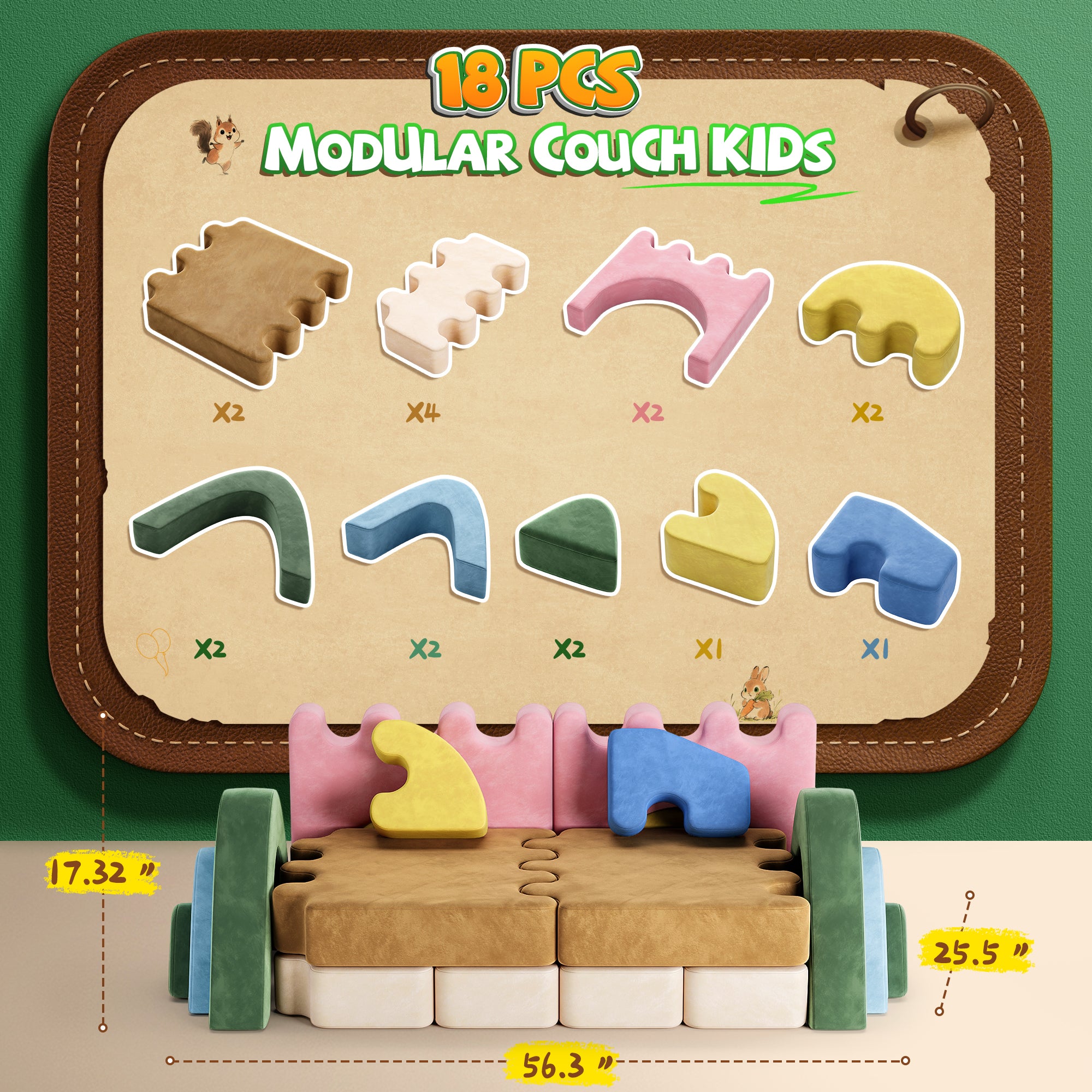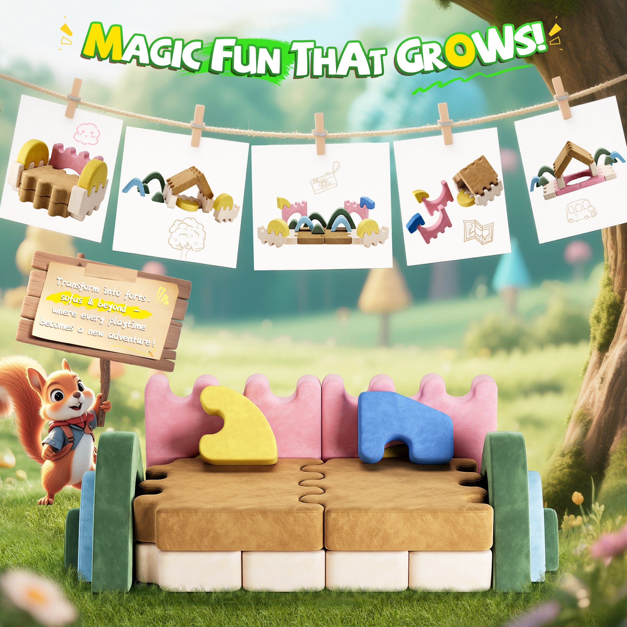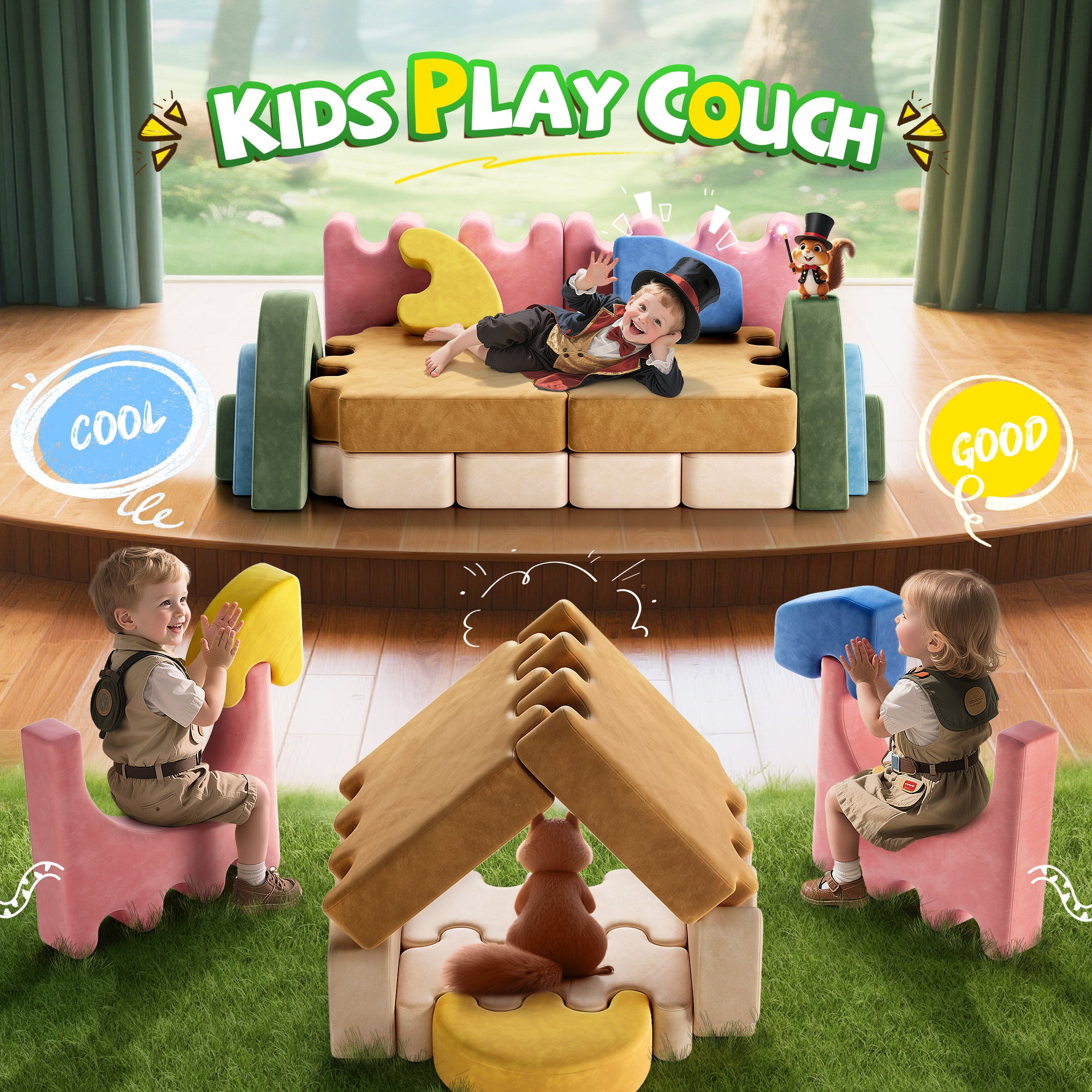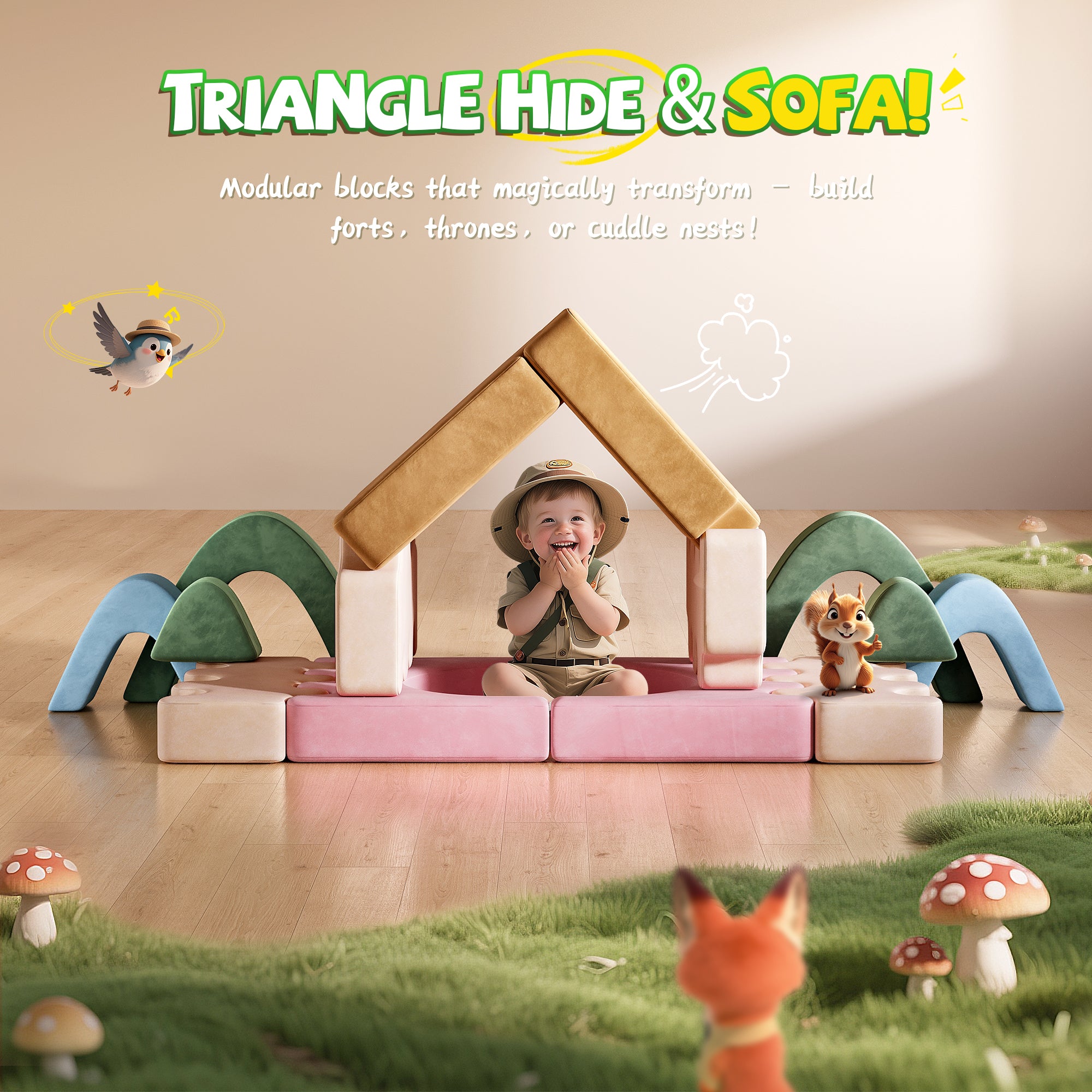 2. The kids play couches combine the function of sofa couch and building forts. Especially designed for kids exploring, all the parts are modular and removable . We recommend customers who only need the kids couch function should use it against wall to keep it more fixed.