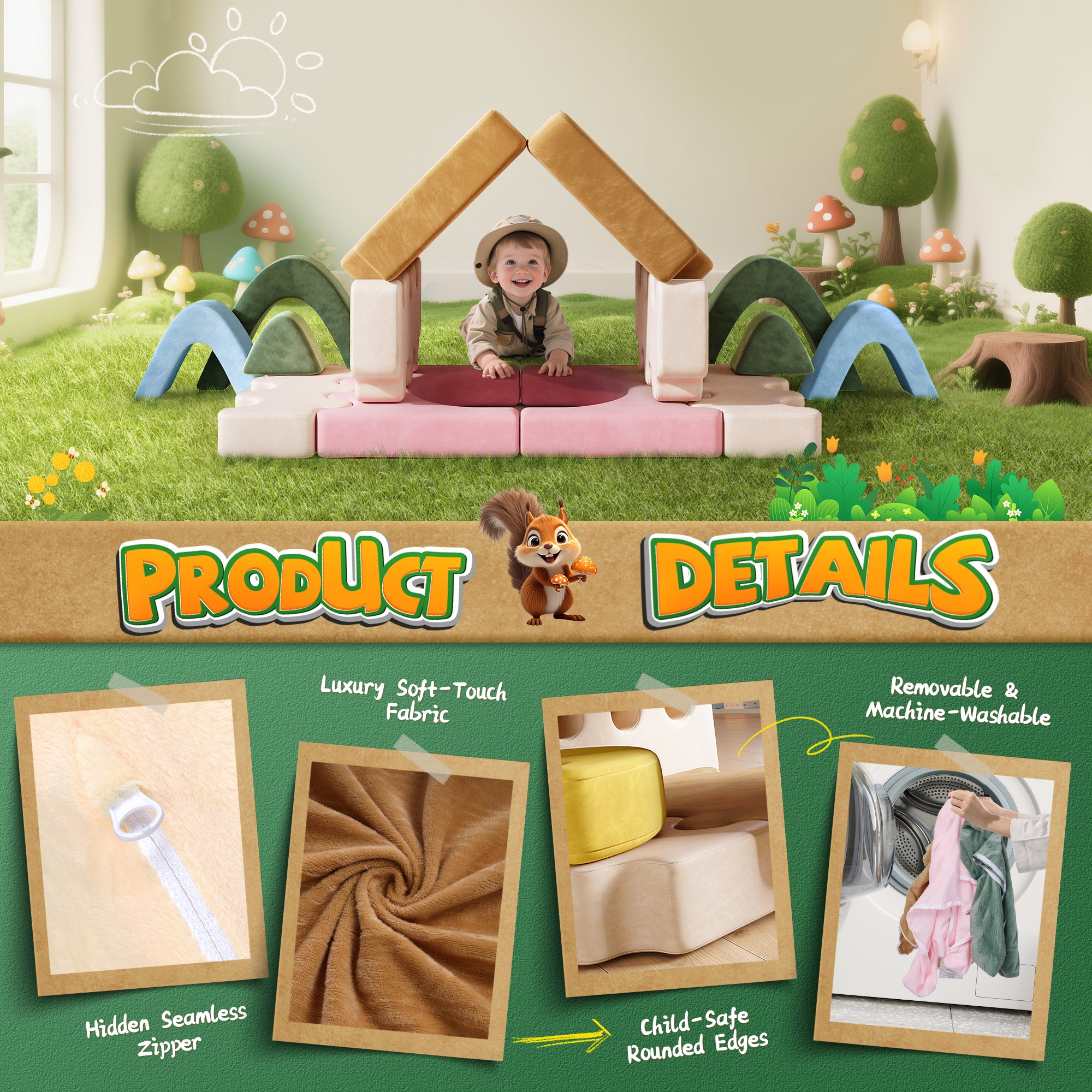 This EVMORE Junlge-themed kids furniture / kids and teen chairs /sofas & couches sparks imagination with vibrant colors and playful shapes. It easily transforms into a sofa, play mat, or bed—perfect for relaxing, climbing, or building forts. Made with high-density foam and soft, washable covers, it's safe, comfy, and easy to clean. Great for solo or group play, it encourages creativity, problem-solving, and social interaction. Ideal for birthdays or holidays, this multifunctional couch blends fun, learning, and comfort—making it a perfect gift for adventurous little ones.