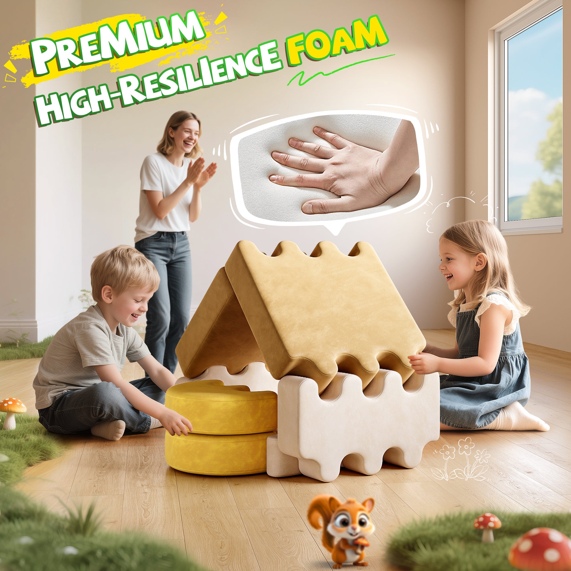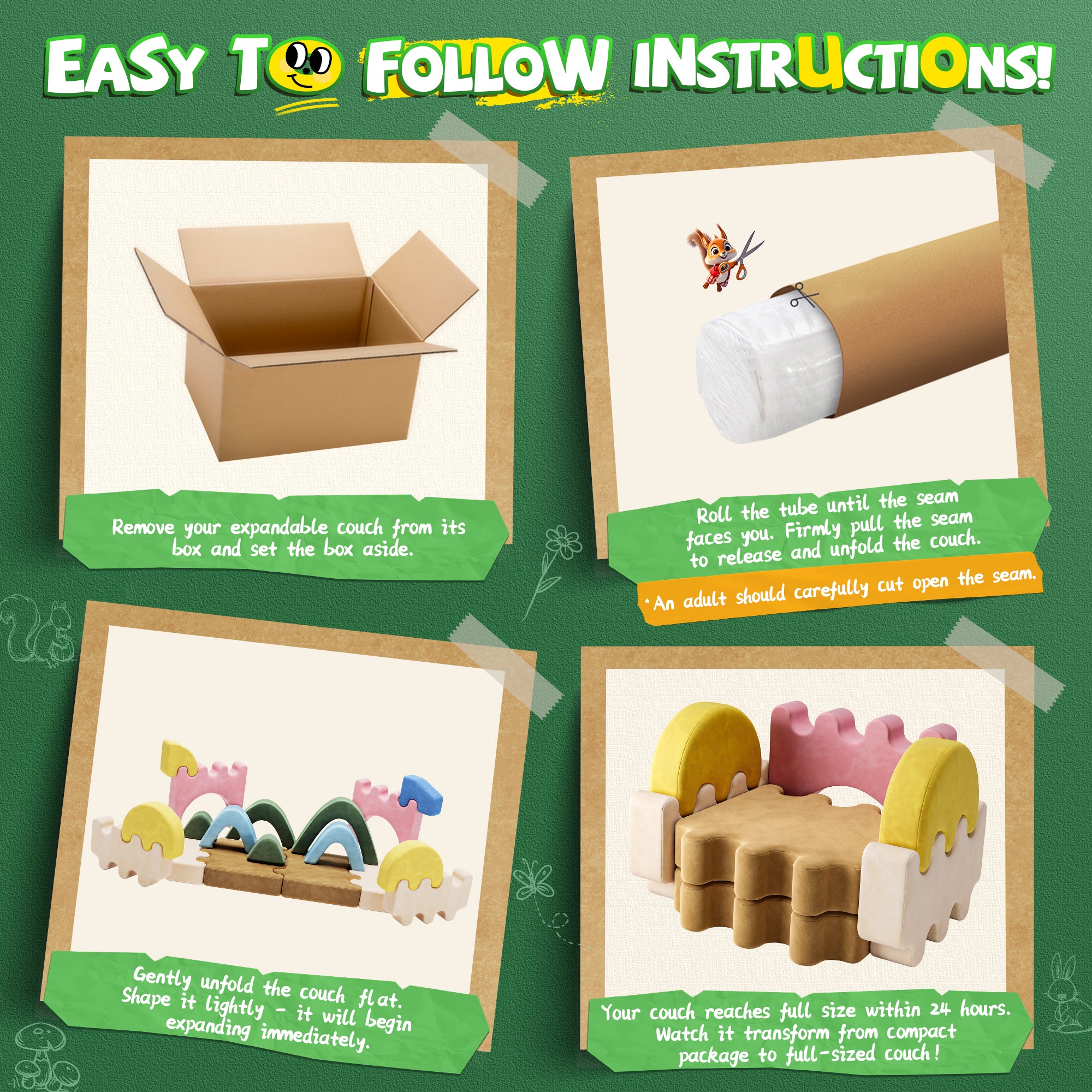 1. Due to machine-compression packaging, The modular kids play couch will be deformed and thin.When you receive the goods, please remove all the packages and open the zippers immediately, waiting for 48-72 hours with patience, then the foam will be restored to its original thickness and shape slowly. If you want to expedite foam recovery and remove sectional wrinkles, it can be achieved by using a hair dryer or garment steamer.