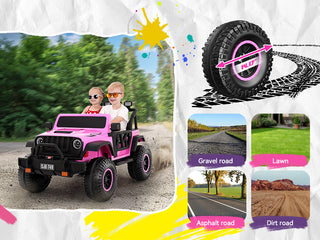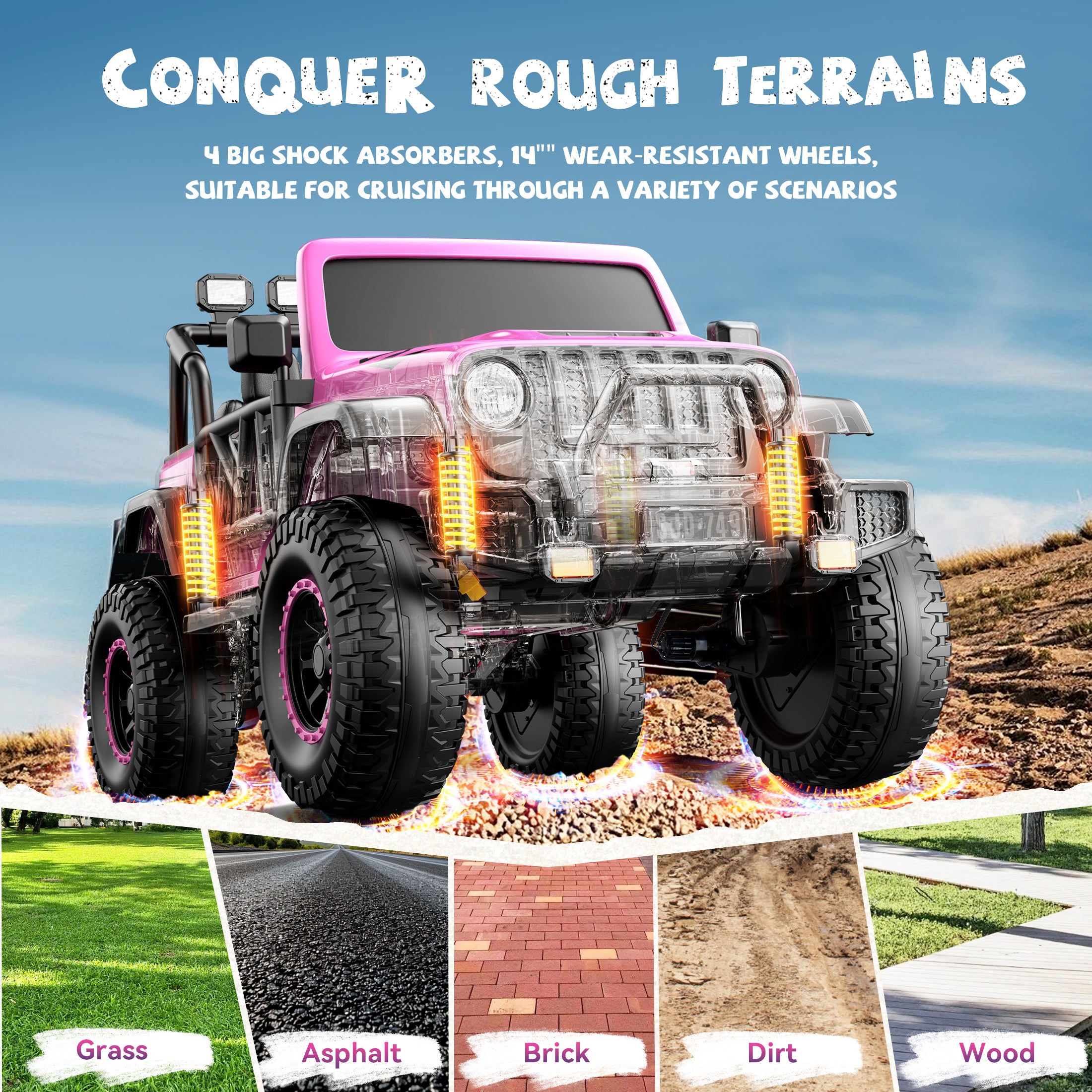 Safe & Stable Ride ASTM F963 certified, featuring a wide dual seat with safety belts and a four-wheel suspension system to reduce bumps and improve stability on uneven surfaces.