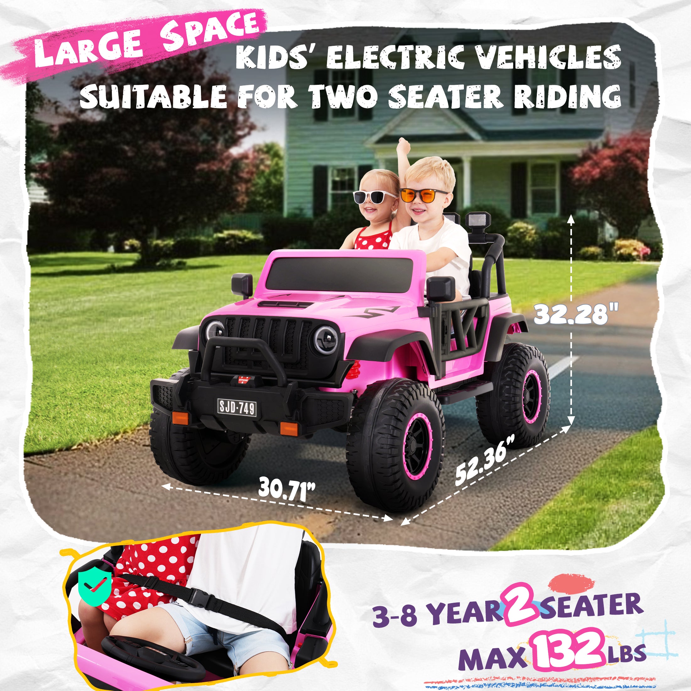 Spacious Dual-Seat Design Designed for shared play, this ride-on truck supports up to 132 lbs and offers a roomy dual-seat layout. Dimensions: 52.36 × 30.70 × 32.28 in (L × W × H).