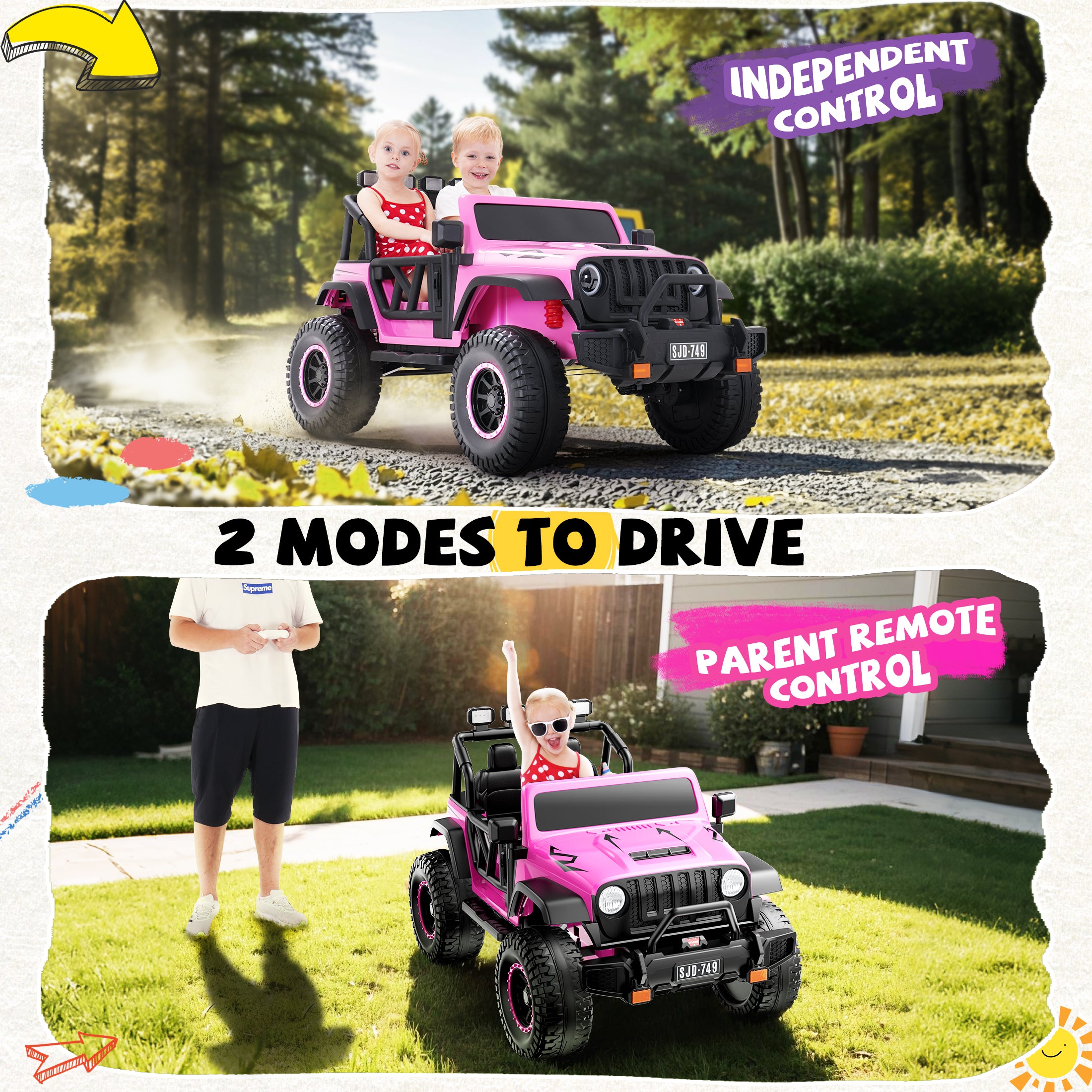 Dual Control Modes Parents can control the truck with a 2.4GHz remote for steering, braking, and speed control, while kids can drive independently using the foot pedal and steering wheel.