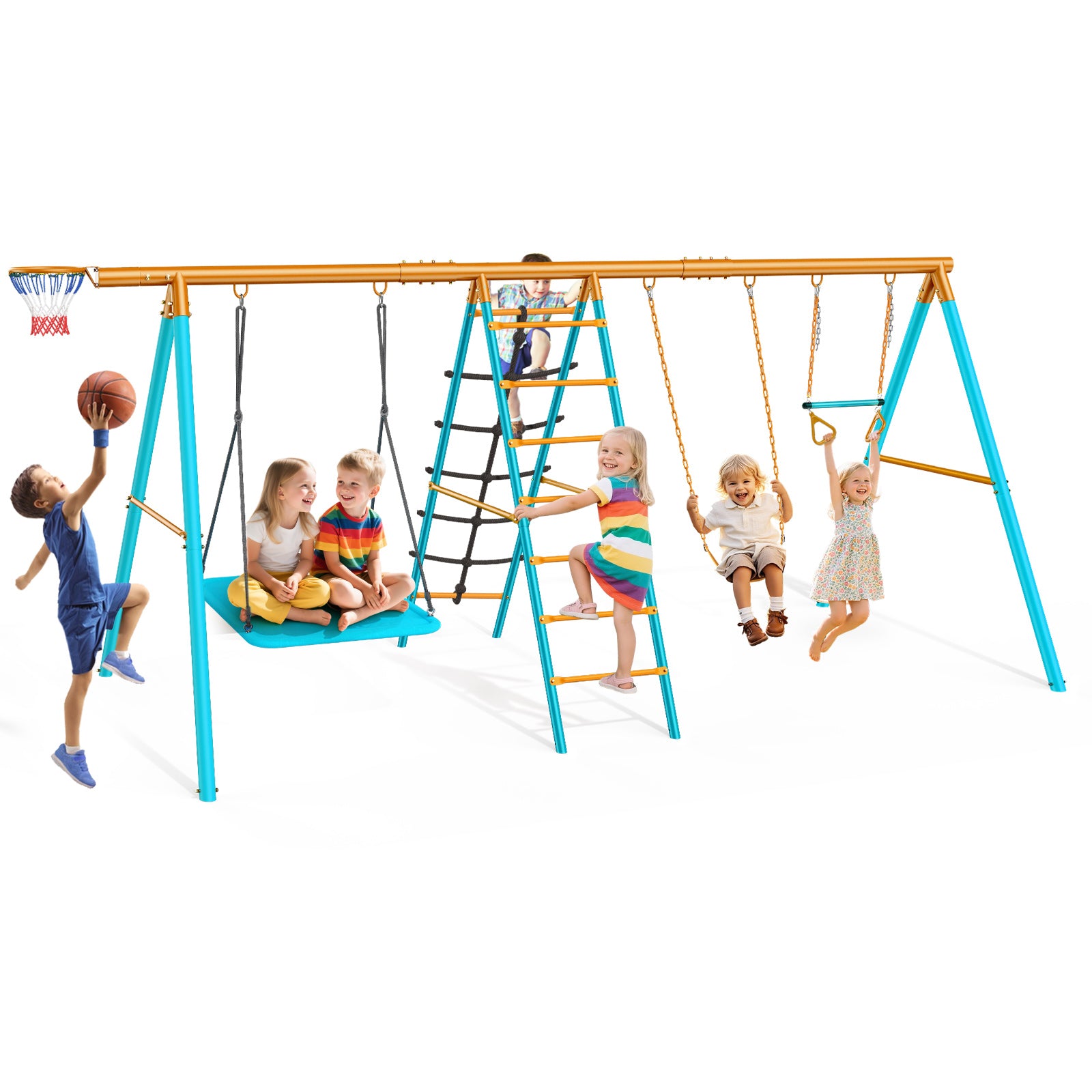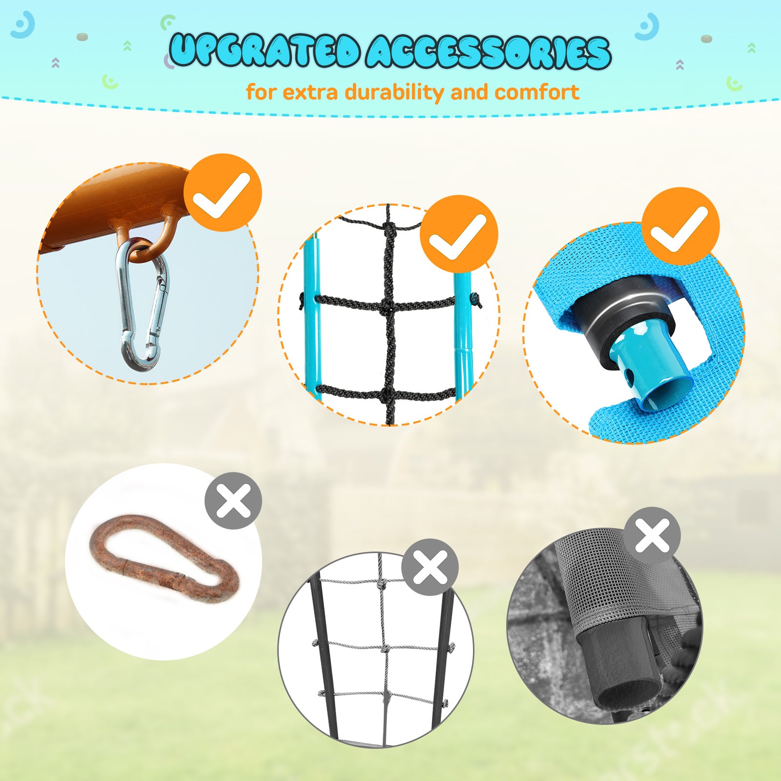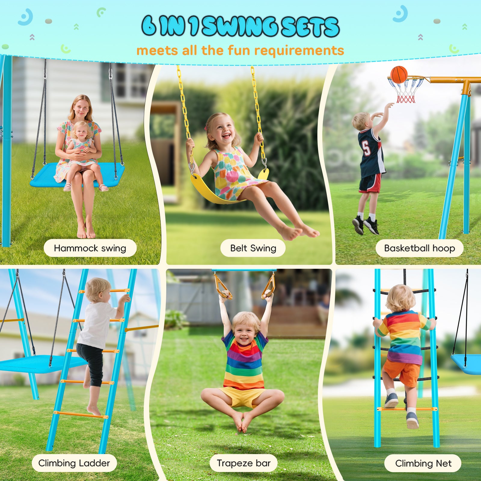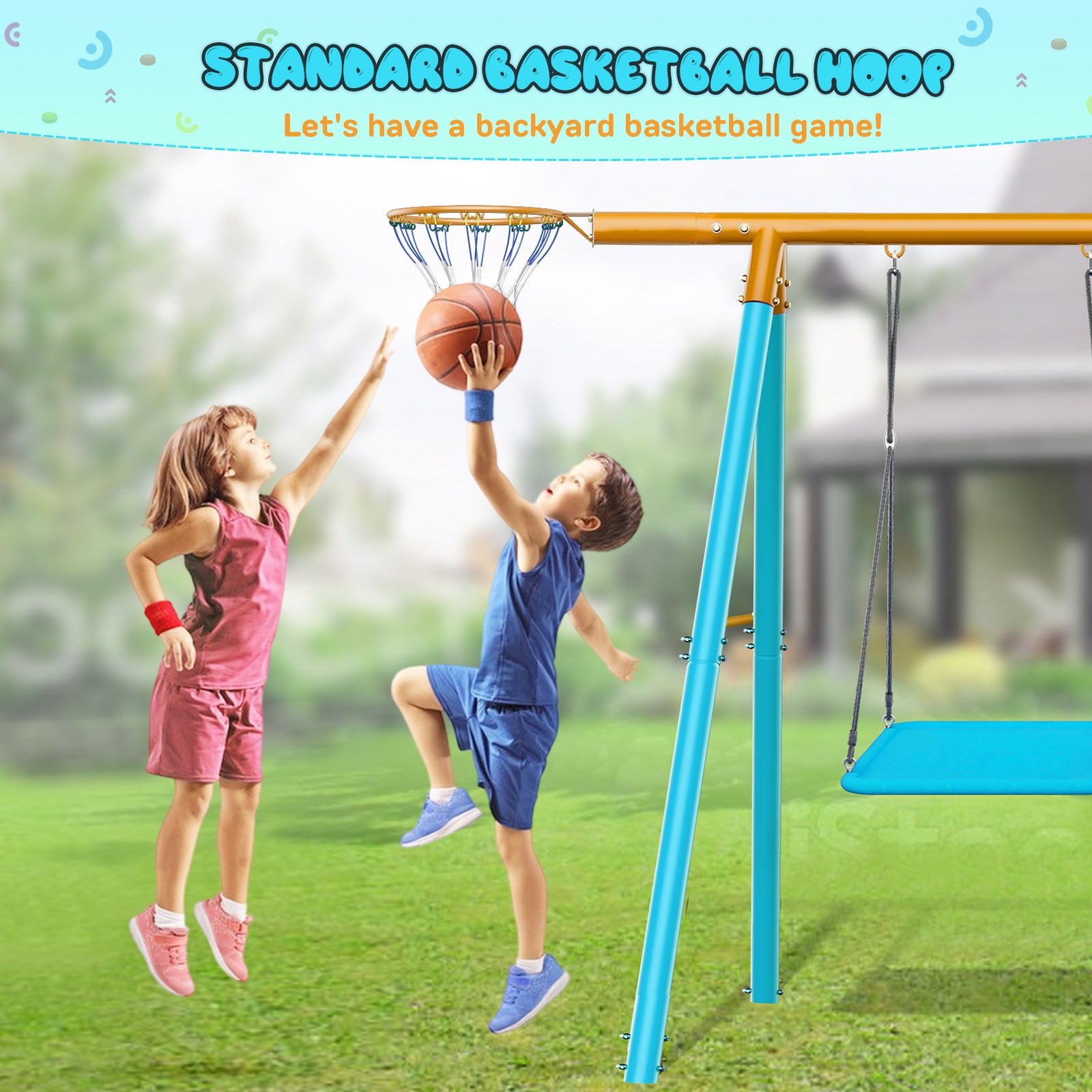 - High-quality Material: The outdoor swing set is made of weather-resistant steel tubes with powder coated paint finish material, which is rustproof and anti-corrosion. It remains undamaged throughout the years and different seasons.