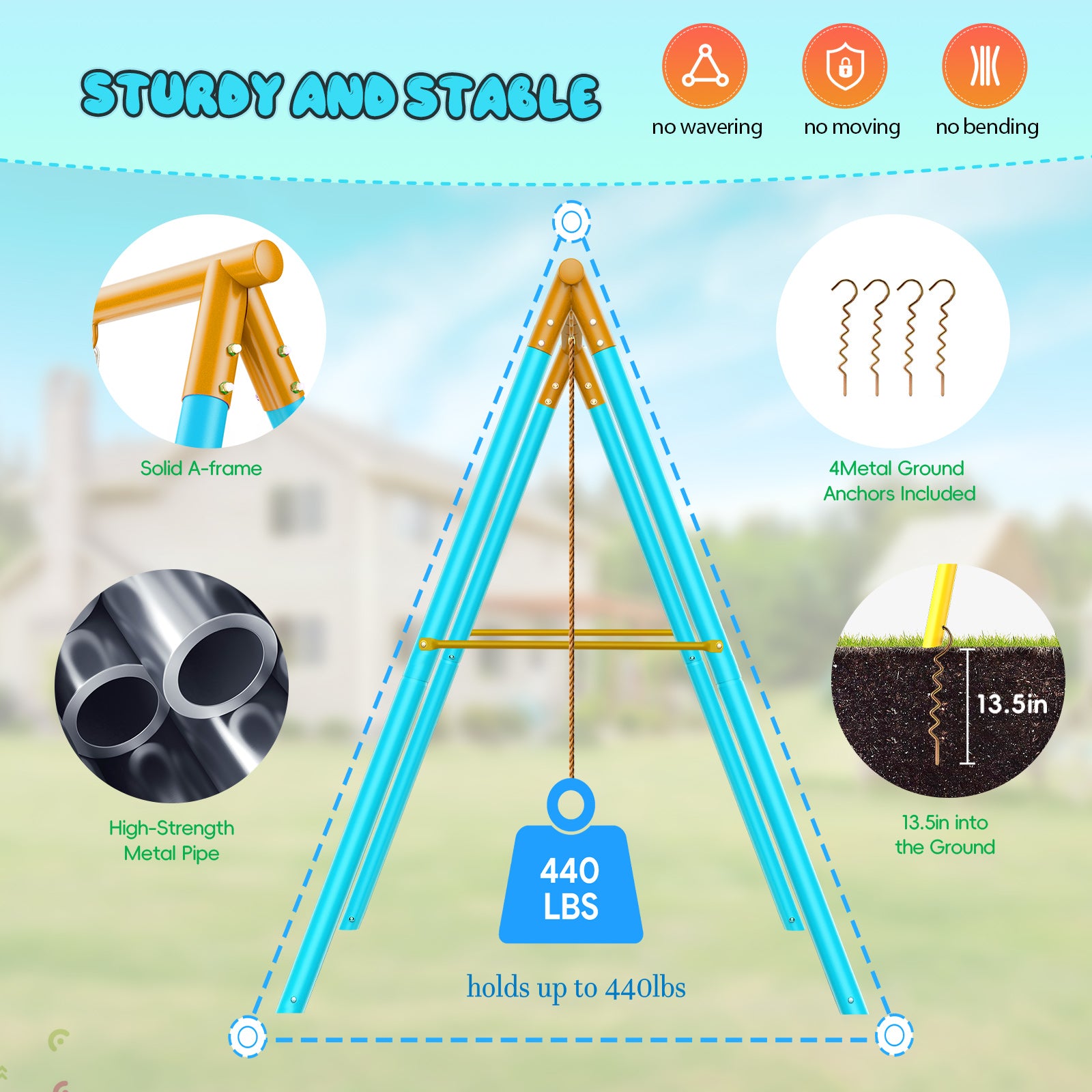 - A-Frame Structure Stand: Featuring with stable triangular A-Frame structure, this swing sets for backyard is effective anti-deformation to ensure that it is safe for children to play. It fits for playground, porches, gardens, etc.