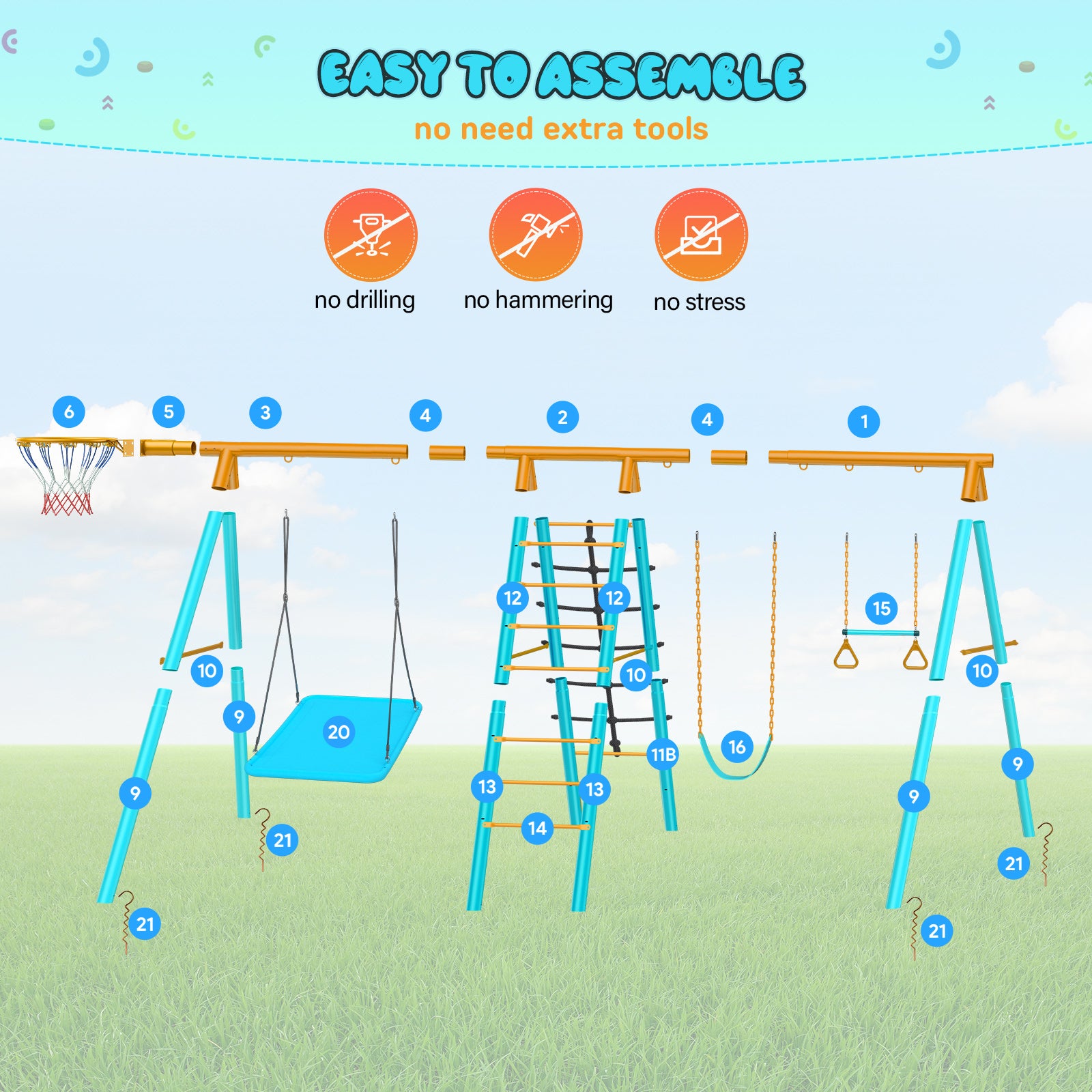 - Clear to Assemble: All accessories are in the package, including four ground stakes. Just follow the installation manual step by step or detailed installation video, then you can get a sturdy outdoor swing sets for kids.